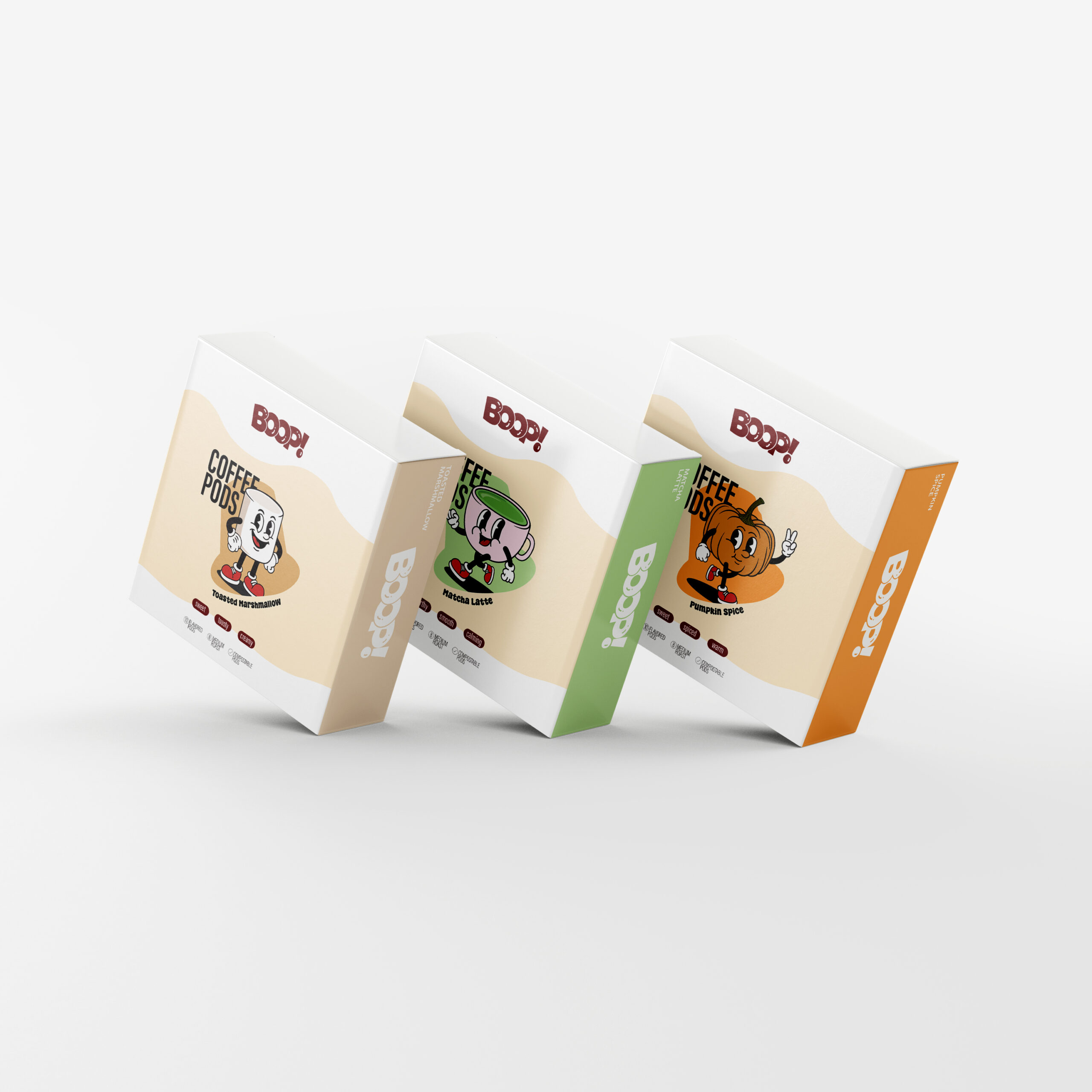 The goal was to create a playful, nostalgic, and character-driven packaging line for flavored coffee pods. Each flavor is represented by a fun mascot that immediately communicates the taste profile and mood. The vision was to blend retro cartoon charm with a clean, modern layout—making the product feel lively, friendly, and instantly eye-catching on shelves.