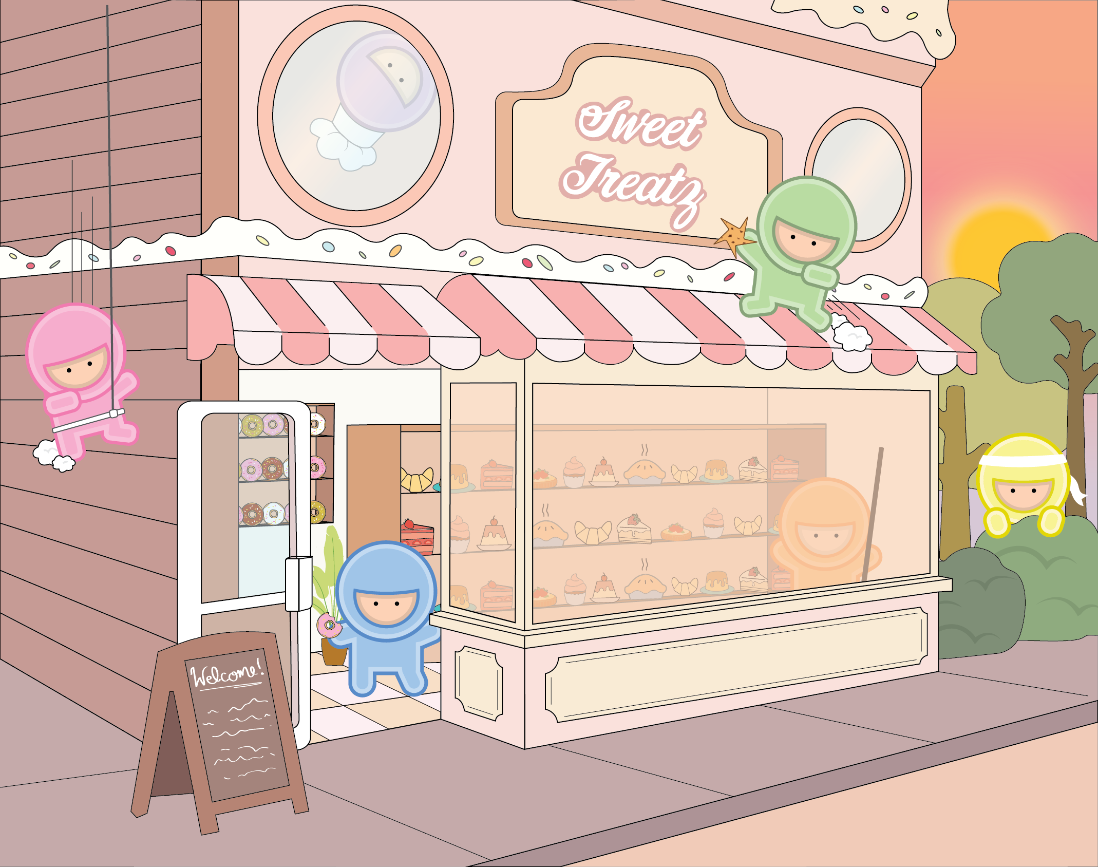 This project is a whimsical digital illustration created for a ninja-themed assignment. The scene features a charming, pastel-colored storefront brought to life by a team of playful, cartoon ninja characters interacting with the environment—swinging from rooftops, sneaking around the shop, and exploring the pastry display.