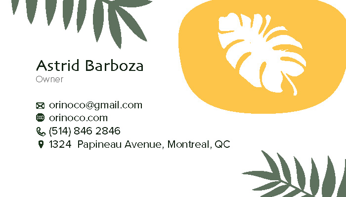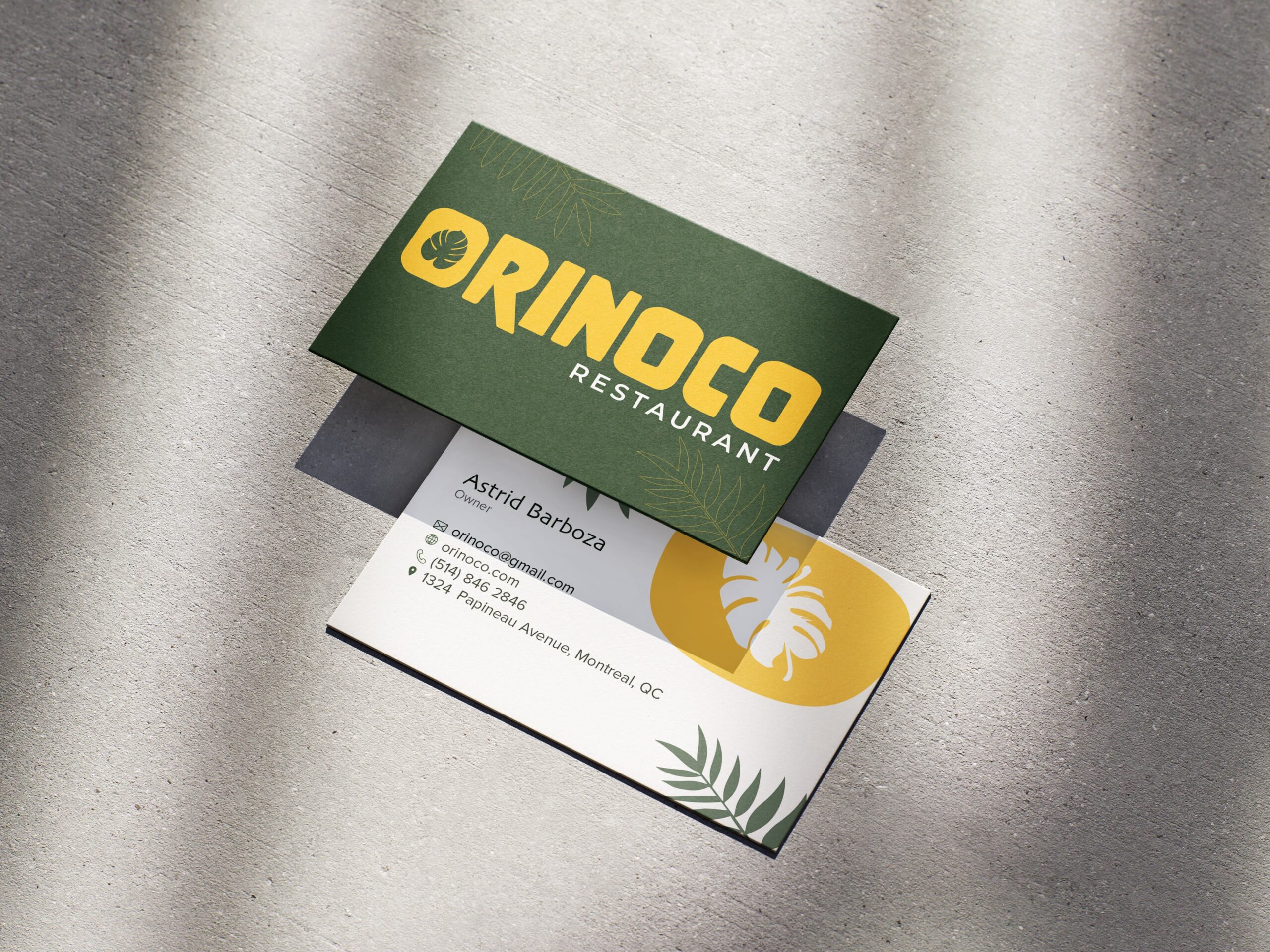 This business card was designed for Orinoco, a Venezuelan-inspired restaurant I built and designed for. I used a deep forest green paired with a vibrant golden yellow to reflect the rich, earthy atmosphere South America. The custom logo features a heavy font with a leaf cutout inside the “O,” reinforcing the restaurant’s tropical identity.
