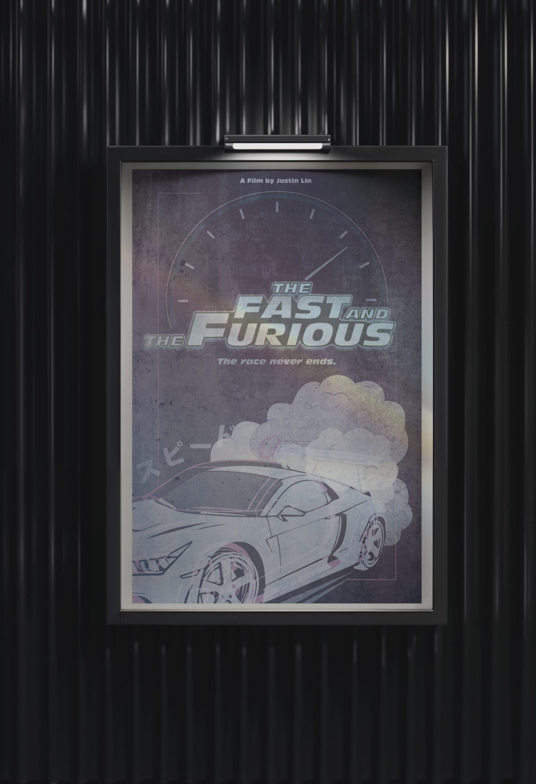 This is a movie poster I designed for The Fast and the Furious. My goal was to show the film’s exciting street racing style. I used only a few cool colours (mostly purples, blues, and pinks, with white highlights) to make it feel like a nighttime city scene. I added a textured filter, using Photoshop, to make the background look grunge and vintage, linking it to the 90’s/early 2000’s aesthetic of the movie. The main part of the poster is a drawing of a sports car coming out of a smoke cloud, which makes you feel the speed and action, giving the poster some movement. I added Japanese writing for “Speed” and a speedometer in the back to reinforce the racing theme. I also tried replicating the movie title, using a combination of textured images and fonts.