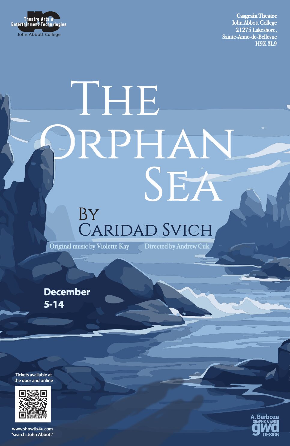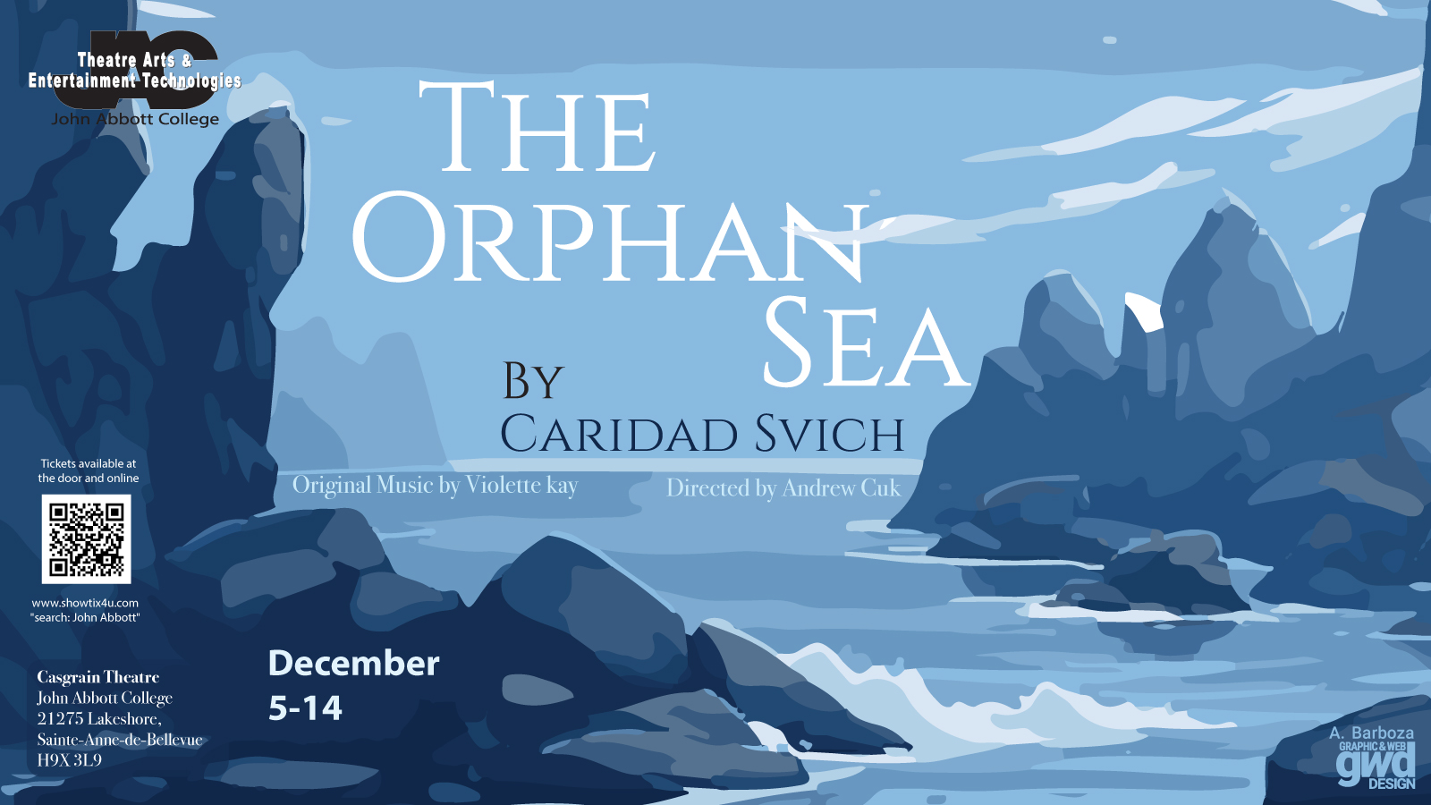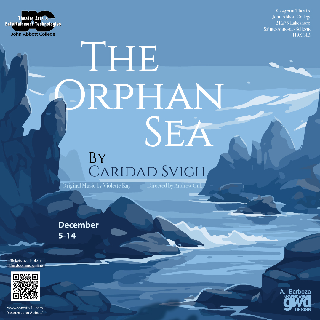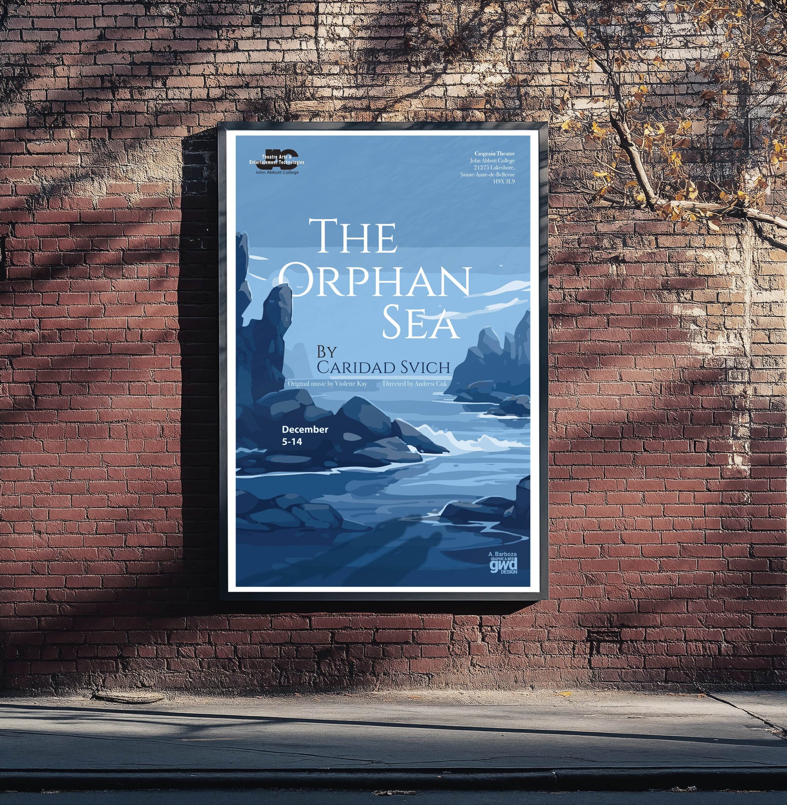 This poster was designed for John Abbott College’s play The Orphan Sea. I used layered shades of blue to capture the calm yet mysterious mood of the sea, and illustrated rocky shores with subtle human shadows to hint at the play’s themes. The title interacts with the artwork—like the cloud passing through the “A”—to add depth and visual interest. The layout balances a bold, elegant title with clear supporting details, creating a poster that feels atmospheric, cohesive, and easy to read.